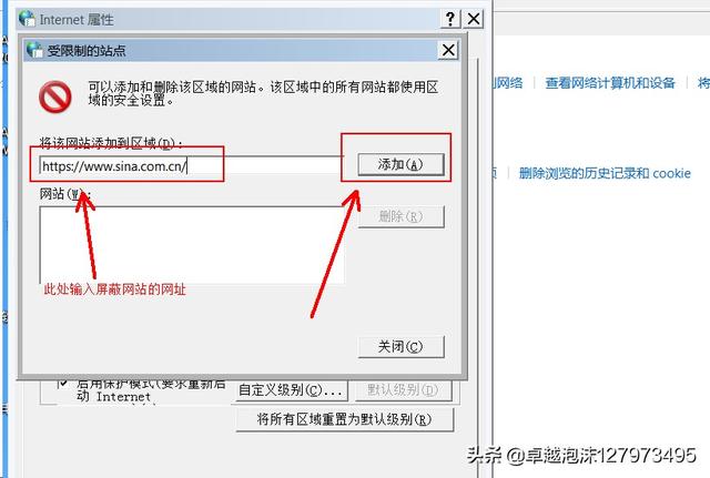 4. 保存后,关闭浏览器,重新打开,浏览器就无法再打开这屏蔽的网站了。 /、还有下边的方法。 1单击屏幕左下方的【开始】按钮,然后选择【控制面板】 /、2进入控制面板之后找到【网络和Internet】点击进入。 /3、进入网络和Internet之后,在对话框右下方找到【Internet选项】然后单击左键进入。//、4然后在对话框找到【安全】选项,单击进入。 /5、在新的对话框中找到点击“受限制的站点”后面的【站点】按钮,然后单击。 /6单击进入之后在【将该网站添加到区域(D):】下面的输入框中输入想要屏蔽的网站网址,然后点击【添加】。 /7、添加成功后网址会显示在【网站】下面的输入框中,此时表示该网站已经屏蔽成功,点击下方【关闭】即可。