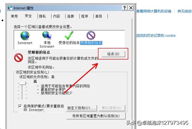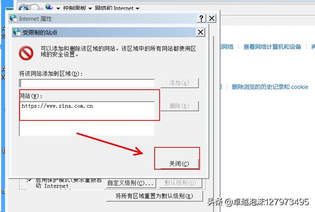 2.控制面板--internet选项--安全--受限制站点--站点--添加