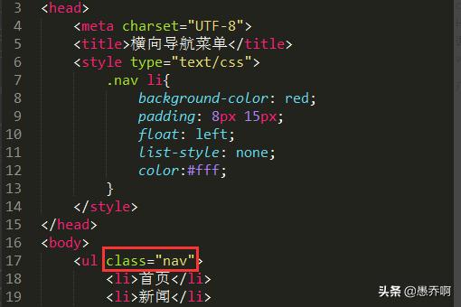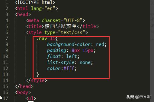 在<style>标签里添加一个样式类为:.nav li{},然后再.nav li类中设置样式背景颜色为红色,浮动为左浮动,内边框上下为8px左右为15px,列表属性为none,字体颜色为白色。