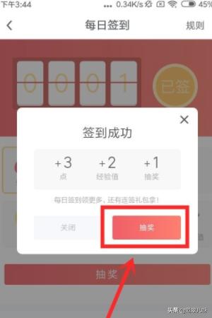 6、在每日签到这个页面中成功进行签到后,在页面中会弹出一个提示框,在这个提示框右下角找到抽奖这个按钮选项,点击即可进行抽奖了。