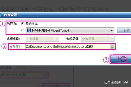 5、 在“转换设置”对话框内我们可以设置输出成其它任意格式,或按原始格式下载到电脑上。如图所示。1、选择“另存为:”→“原始格式”或下载同时转换别的格式;2、设置视频的输出路径;3、点击右下角的“下载”按钮。