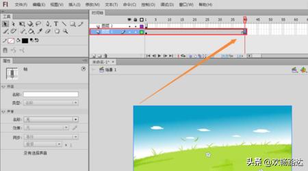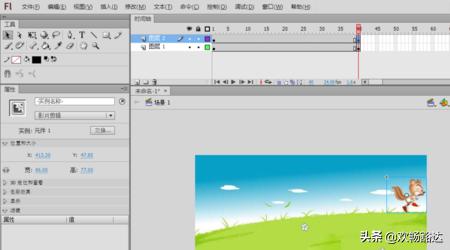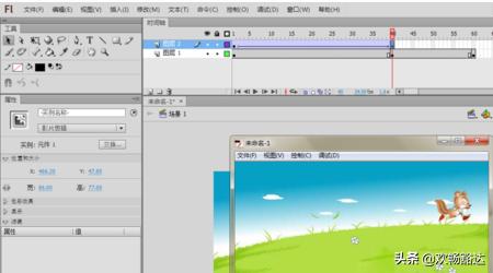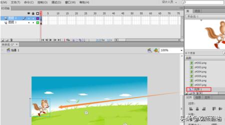 8.点击图层二,在40的格子方法点击f6创建关键帧,并将小狐狸的位置拖动到另一边。