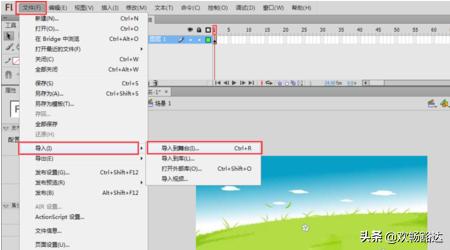 2.打开【文件】点击【导入】-【导入到舞台】,将背景图片导入进去。