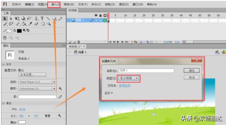 3.点击【插入】然后【建新元件】,选择【影片剪辑】,点击确定。