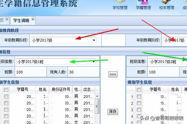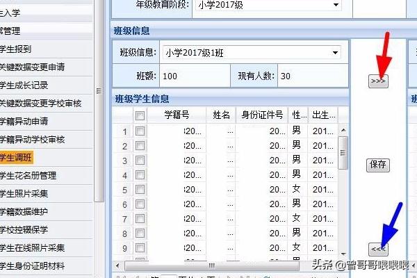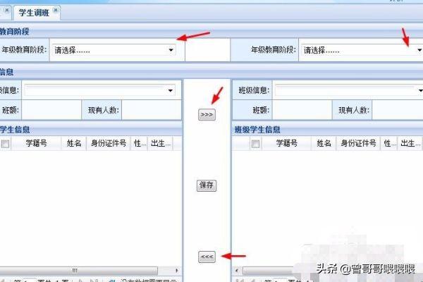 6.红色”箭头指的键是把学生从1班调入2班。“蓝色”箭头指的键是把学生从2班调入1班。调班前先选择好学生,在学生前面的小方筐点勾为选择上。